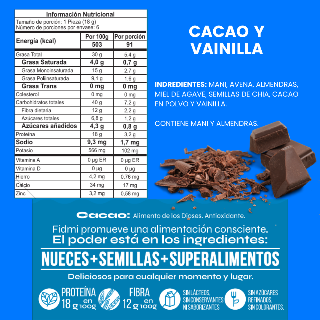 - Dive into a delightful fusion of Cacao (Chocolate), Oats, Almonds, Chia Seeds, and Vanilla. Each flavor is a unique journey, offering a harmonious blend of taste and nutrition for an unparalleled snacking experience.