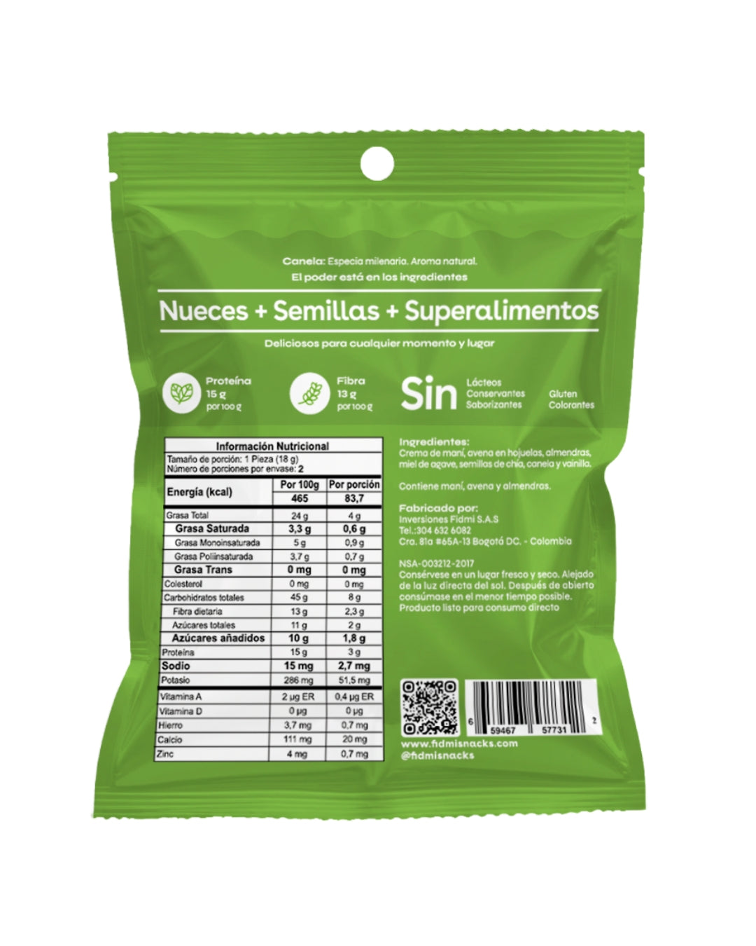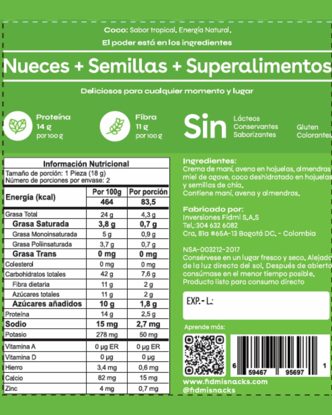 Maní, avena, almendras, miel de agave, semillas de chía, hojuelas de coco.